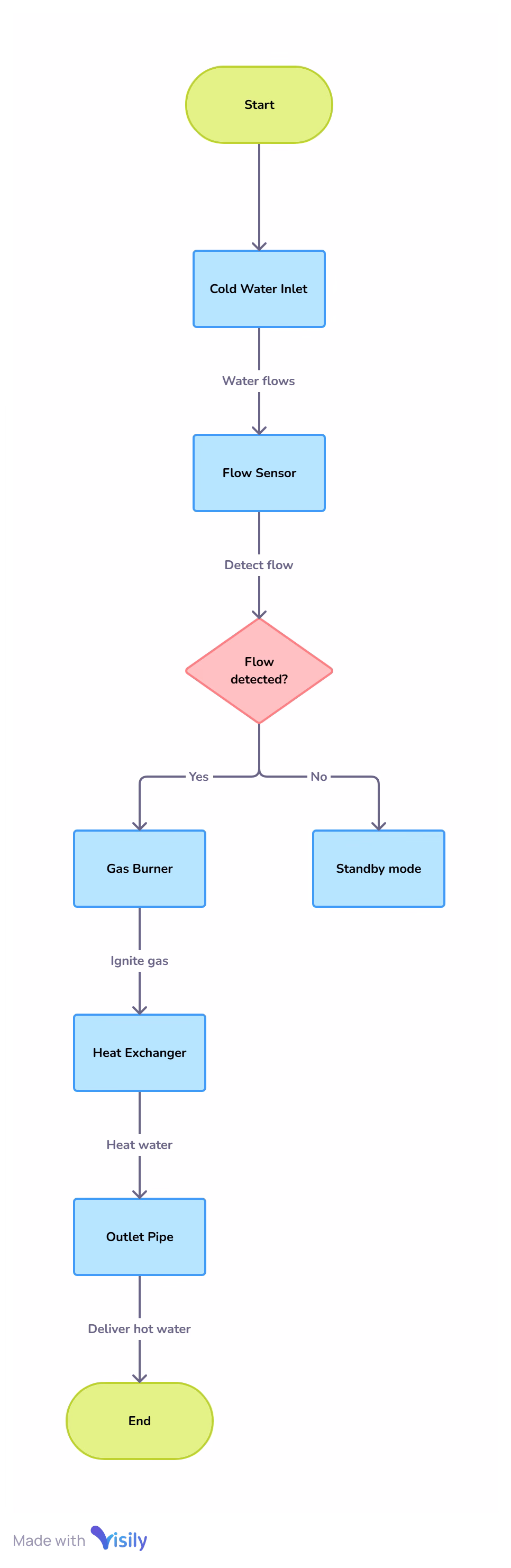 - Continuous Flow: The heated water then flows directly to your tap, providing consistent hot water without delay.